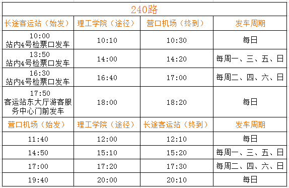 經(jīng)公司營運(yùn)部門與機(jī)場工作人員溝通:從2018年3月25日起,營口藍(lán)旗機(jī)場執(zhí)行新的航班時(shí)刻表(部分航線停發(fā))。針對(duì)上述情況,為方便市民出行,經(jīng)公司研究,現(xiàn)對(duì)機(jī)場240路運(yùn)營班次進(jìn)行調(diào)整。具體內(nèi)容如下: